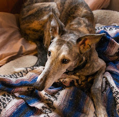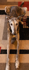 Like any greyhound, she loves her treats and this afternoon we discovered that she can catch them if you toss them to her. She has a lovely lush coat with a pretty little wave between her shoulder blades. Put a coat on her this morning and she went willingly out in the snow, particularly along the fence where the birds and squirrels hang out. She had a "conversation" with a mixed breed black dog that lives two yards over and tried to get Kelly to play with her by bouncing back and forth in a playbow, but Kelly's reserving judgment.